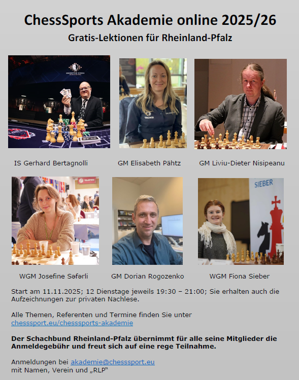 die ChessSports Akademie veranstaltet vom 11.November 2025 bis zum 17.Februar 2026 eine Trainings- und Fortbildungsreihe mit namhaften Spielern und Trainern.